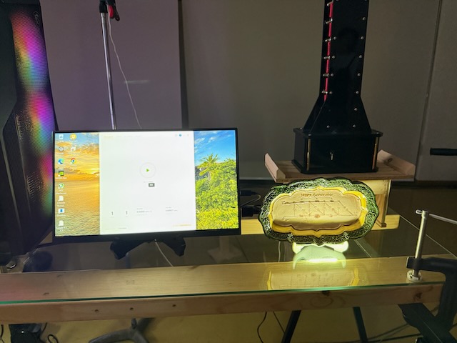 会場の吹子に息を吹きかけると、遠くの会場にシャボン玉が舞います。